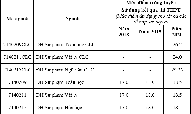 Điểm của 3 ngành đào tạo chất lượng cao là toán, lý, văn lần lượt là 29,25 cao hơn các ngành còn lại là 26,2, 24 và 24 điểm. Yêu cầu bổ sung đối với mỗi chuyên ngành là tổng điểm ba môn đạt từ 24 điểm trở lên, trong đó có không dưới 8 môn chính. Do chỉ tiêu ít và điểm chuẩn các môn này cao nên mỗi môn chỉ tuyển được 10 học sinh. . -Các môn còn lại chủ yếu là 15, khoảng 16-19,5.